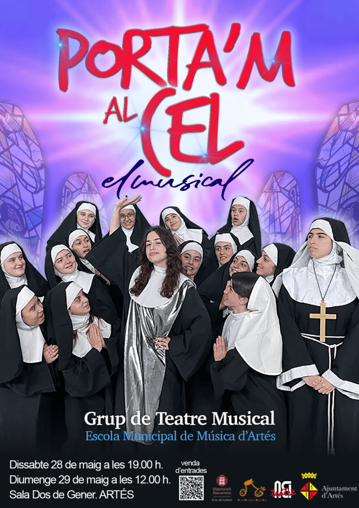 Els alumnes de Teatre Musical de l’Escola, col·laboració entre NEI Teatre i l’Escola, estrenaran aquest cap de setmana, 28 i 29 de maig, l’obra musicada Porta’m al cel, un espectacle que durant el curs han anat treballant. Ens apropa la història d’una jove aspirant a cantant, la vida de la qual fa un canvi radical en el moment que es converteix en testimoni d’un assassinat, i la policia l’amaga en un convent. Peripècies i vivències divertides que faran divertir el públic. Cançons i música en seran un plat fort i molt destacat en aquest musical, que comptarà amb l’acompanyament en directe a càrrec dels professors de l’Escola de Música. Les entrades per a les funcions les podeu trobar a cultura.artes.cat
