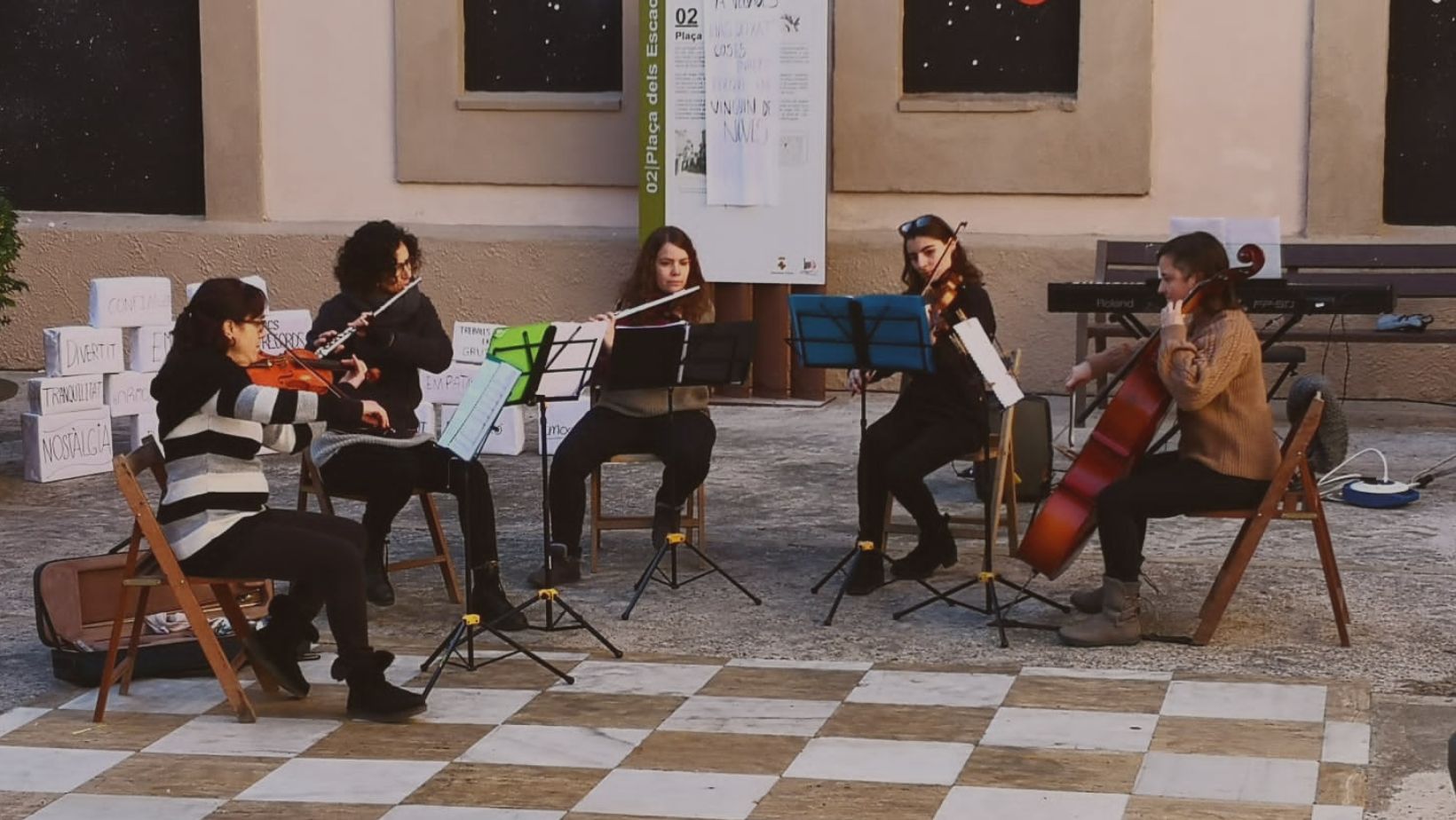 Dins del marc del I Mercat de Nadal d’Artés es va celebrar la presentació del projecte Camins només d’anada impulsat per La caixa de vidre -Oriol Segon, Quim Moya i Quim Torres- i l’Ajuntament d’Artés.El projecte, que s’ha estat desenvolupant al municipi els darrers mesos de l’any, va culminar amb la creació d’un mural a la Plaça dels Escacs d’Artés. En l’acte hi van participar Les Ventcordades, formació instrumental de l’Escola de Música, i alumnes del projecte ART360 impulsat des de l’Escola Municipal de Música i amb el suport de l’INS Doctor Ferrer d’Artés, que es van encarregar de posar música a l’acte i de fer una lectura de textos.